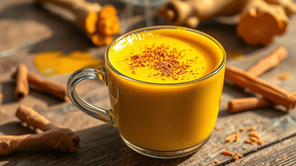 Sie profitieren von den entzündungshemmenden und antioxidativen Eigenschaften von Kurkuma-Milch, die Ihr Immunsystem stärken und Gelenkschmerzen reduzieren können. Für optimale Wirkungen sollten Sie täglich etwa 500-1000 mg Kurkuma einnehmen. Wenn Sie Milchalternativen wie Mandel- oder Kokosmilch bevorzugen, sind diese ebenso geeignet und passen zu laktoseintoleranten oder veganen Diäten. Fügen Sie Gewürze wie Zimt oder Ingwer für zusätzlichen Geschmack und gesundheitliche Vorteile hinzu, sodass Ihre Kurkuma-Milch sowohl schmackhaft als auch nährend ist.
