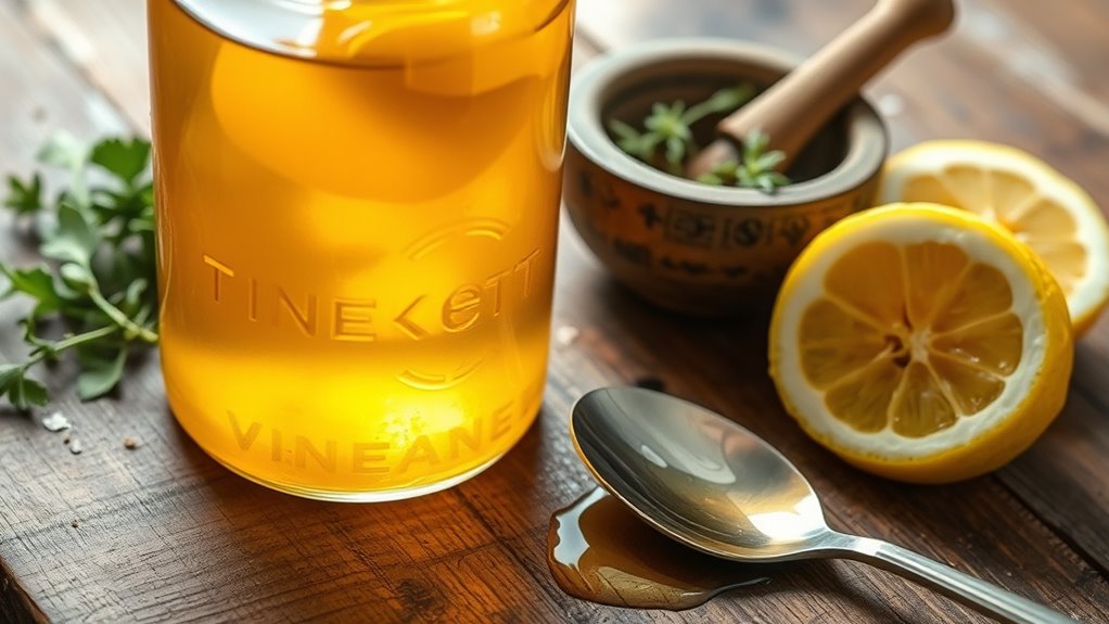 Um dein eigenes Oxymel herzustellen, beginne damit, hochwertigen Honig und Essig auszuwählen—Apfelessig funktioniert gut. Erwärme den Honig vorsichtig, falls nötig, dann füge Kräuter wie Ingwer oder Thymian hinzu und lasse sie etwa eine Woche lang in einem sauberen Glas ziehen, dabei täglich schütteln. Mische den infundierten Honig mit Essig im Verhältnis 1:2, rühre gut um und bewahre es an einem dunklen, kühlen Ort für zwei Wochen auf, damit sich die Aromen entfalten können. Bleibe neugierig und entdecke weitere Tipps, um dein Elixier zu perfektionieren.