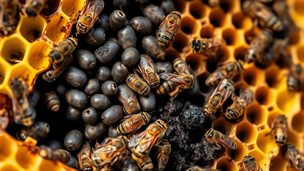 Um Amerikanische Faulbrut zu erkennen, suchen Sie nach eingefallenen, verfärbten Brutwaben mit einem fauligen Geruch und klebrigen Ablagerungen, die oft infiziert sind mit toten Larven. Testen Sie Proben rasch, um das Vorhandensein von *Paenibacillus larvae*, dem Bakterium, das die Krankheit verursacht, zu bestätigen. Um dagegen vorzugehen, zerstören Sie infizierte Waben durch Verbrennen und erhalten Sie starke, gesunde Bienenstöcke durch gute Hygiene und regelmäßige Kontrollen. Achten Sie auf Präventionsstrategien—fahren Sie fort, weitere Wege zu erkunden, um Ihren Bienenstock effektiv zu schützen.
