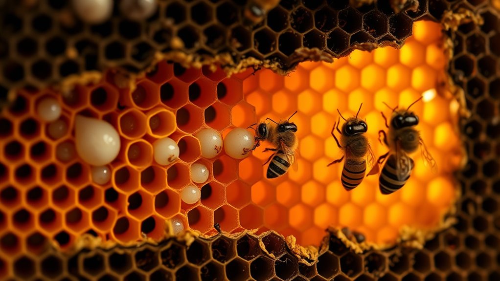 Sie sollten wissen, dass Umweltfaktoren wie Temperatur, Luftfeuchtigkeit und Nahrungsverfügbarkeit entscheidend die Entwicklung des Bienenstocks beeinflussen. Eine richtige Honiglieferung stellt sicher, dass die Bienen Energie für die Brutpflege und die Wartung des Stocks haben, während Bienenstockarchitektur die Luftzirkulation und Temperaturregulierung beeinflusst. Diese Faktoren helfen, optimale Bedingungen für die Kolonie aufrechtzuerhalten, was ein gesundes Wachstum und eine erfolgreiche Entwicklung unterstützt. Durch die Steuerung dieser Elemente ermöglichen Sie es dem Bienenstock, zu gedeihen und sich an wechselnde Umweltbedingungen anzupassen.