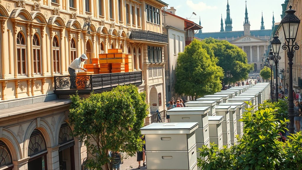 In Wien floriert urbanes Imkern zwischen historischen Straßen und üppigen Grünflächen. Imker verstecken kleine Bienenstöcke in Hinterhöfen, auf Dächern und in Parks, um die lokale Artenvielfalt zu fördern. Trotz Herausforderungen wie begrenztem Raum und Umweltverschmutzung passen sie sich an durch Gemeinschaftshilfe, innovative Praktiken und Zusammenarbeit mit städtischen Initiativen. Diese Bemühungen tragen dazu bei, dass urbanen Bienen gedeihen und die ökologische Gesundheit gestärkt wird. Wenn Sie weiter recherchieren, werden Sie entdecken, wie Wiens Stadtbienen und ihre Imker eine nachhaltige urbane Umwelt prägen.