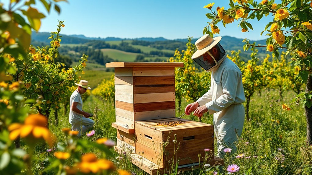 Betrachten Sie Ihre Imkerei als einen zarten Tanz, bei dem der Einsatz von Chemikalien den Rhythmus stören kann. Um Chemikalien zu vermeiden, praktizieren Sie natürliche Schädlingsbekämpfungsmethoden, wie das Einführen von Räuberinsekten oder die Verwendung von gitterböden mit Bodenabdeckungen. Wählen Sie organische Futteroptionen und erhalten Sie die Gesundheit des Bienenstocks durch regelmäßige Inspektionen. Dieser Ansatz hält Ihre Bienen gesund, ohne Chemikalien, und sorgt für eine blühende, widerstandsfähige Kolonie, die im Einklang mit dem Rhythmus der Natur tanzt.