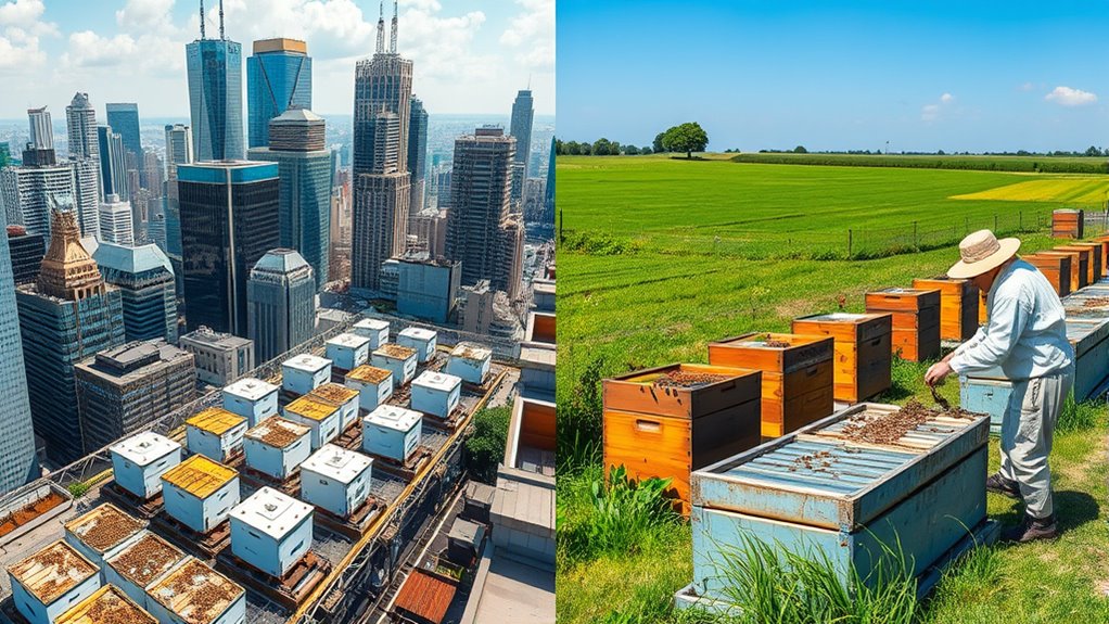 Im städtischen Imkerei bietet eine vielfältige Blumenquelle und einzigartige Honigsorten, aber Sie müssen Verschmutzungsrisiken managen und die Gesundheit der Bienenvölker sorgfältig überwachen. Ländliche Imkerei sorgt für sauberere Luft und natürlicheren Honig, obwohl Pestizide von Feldern eine Bedrohung darstellen können. Ihre Wahl beeinflusst die Honqualität, das Bienengesundheit und die Umweltbelastung. Um zu verstehen, wie Sie Ihre Imkereiumgebung optimieren und die Herausforderungen jeder Umgebung bewältigen können, erkunden Sie, was als Nächstes kommt.